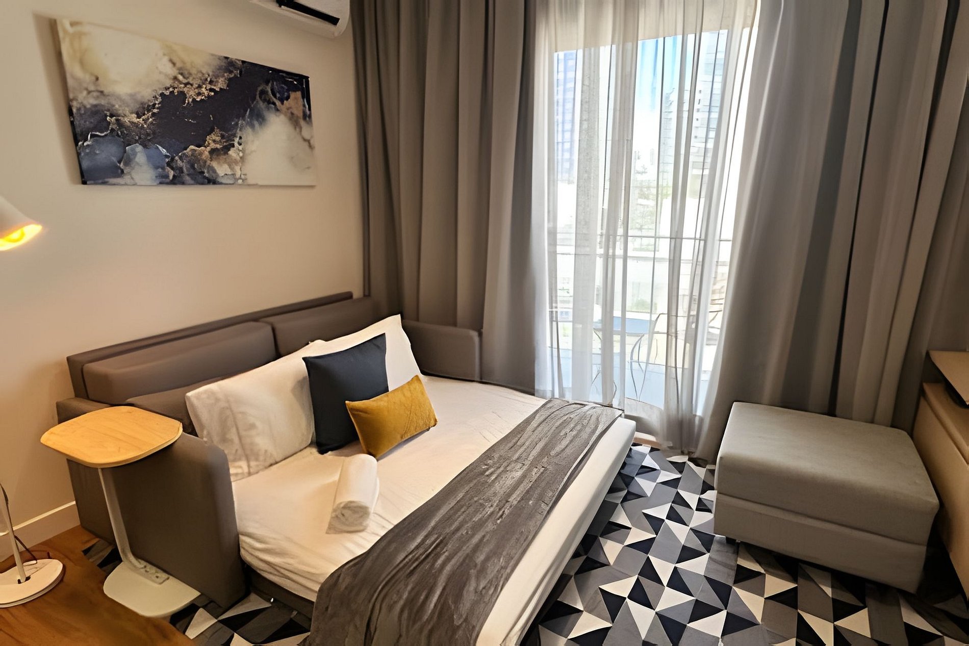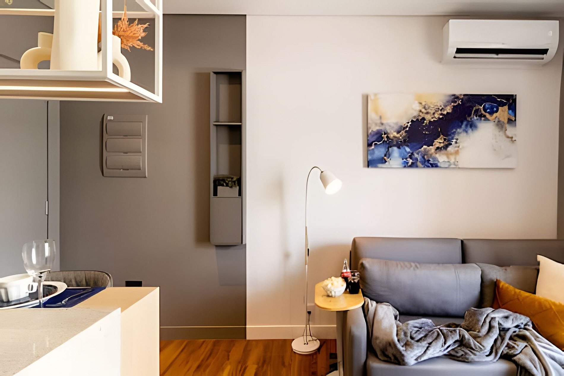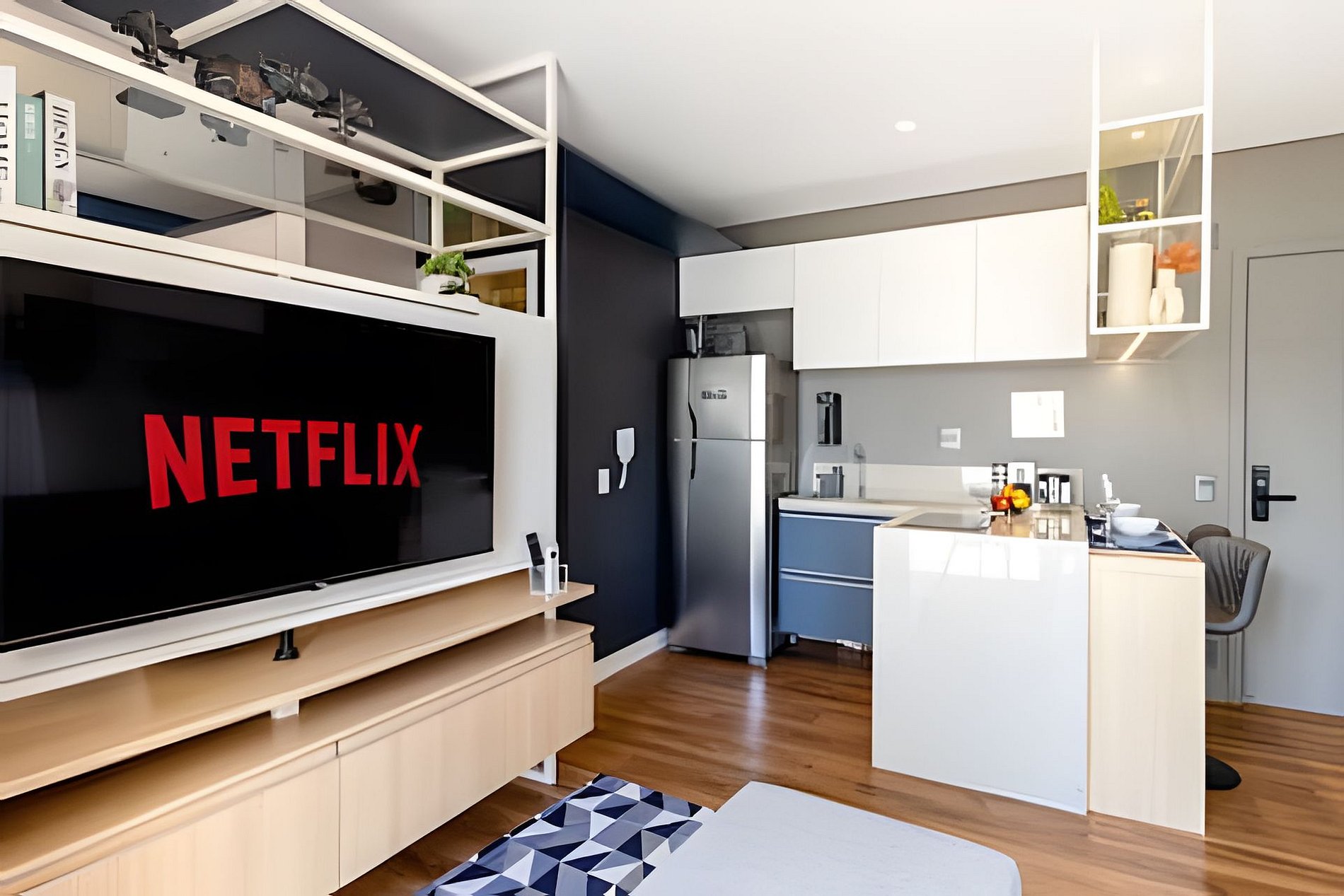 Ambiente climatizado com ar-condicionado Estação de trabalho para home office Sofá-cama Queen para 2 pessoas Mesa de jantar para 2 pessoas, perfeita para refeições especiais Integração harmoniosa com a cozinha