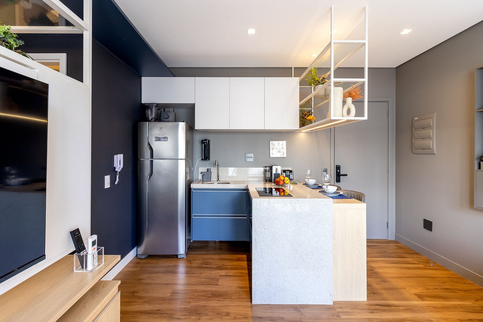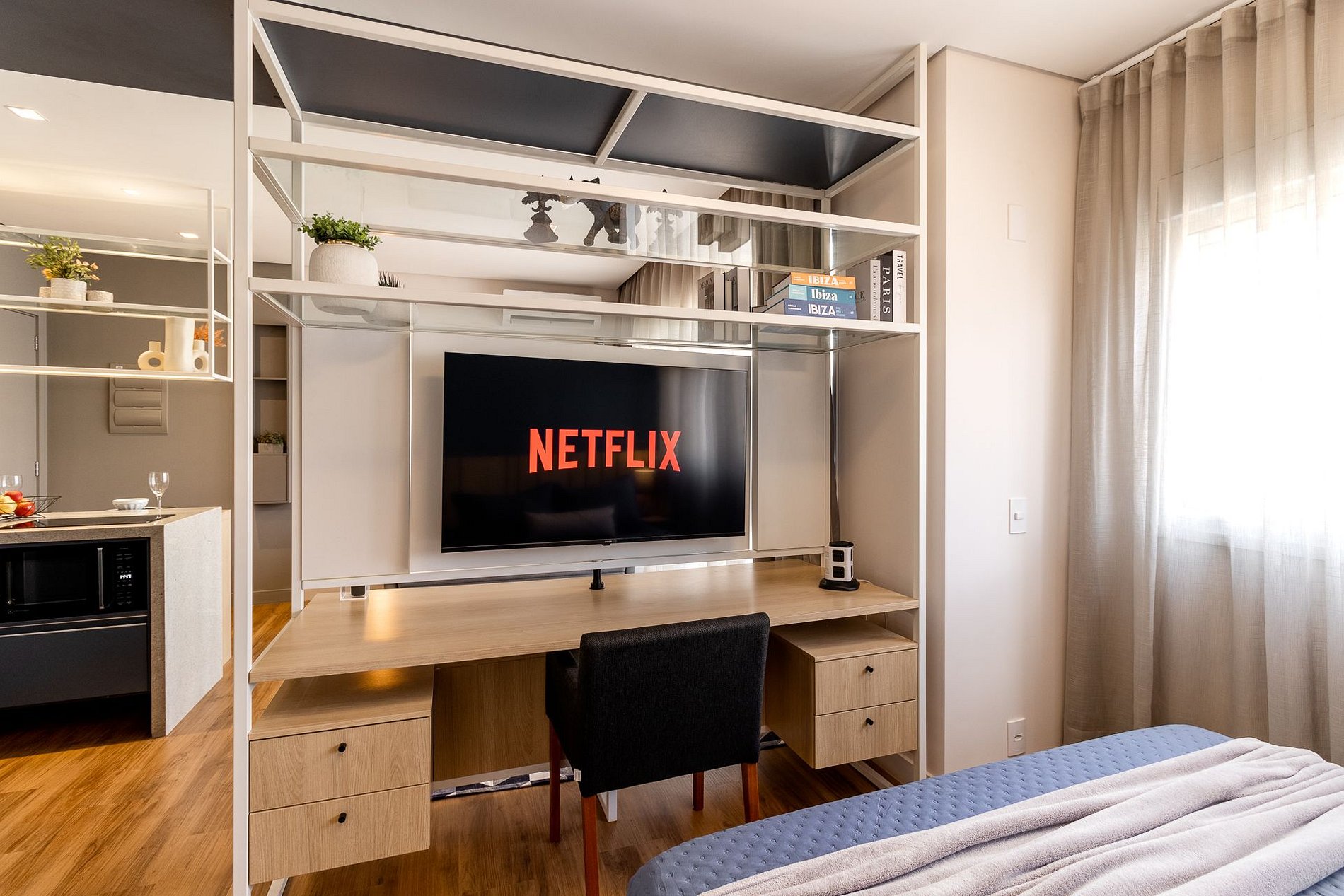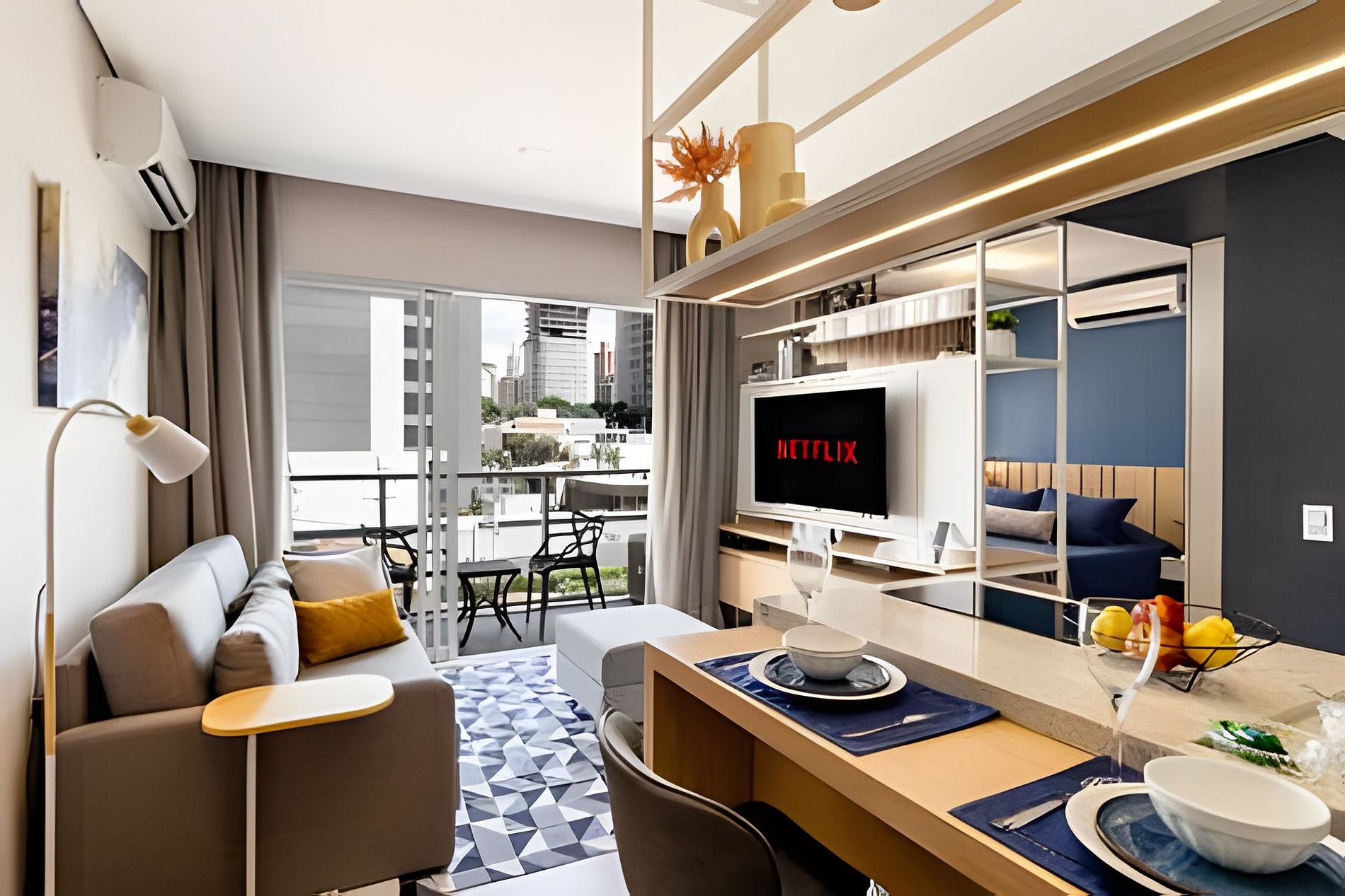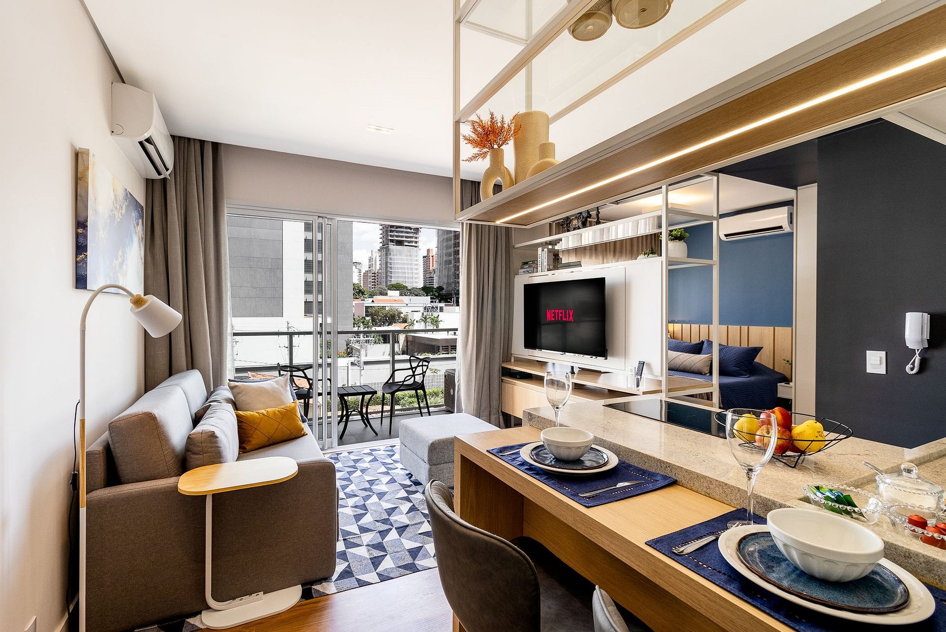 Ambiente climatizado com ar-condicionado Estação de trabalho para home office Sofá-cama Queen para 2 pessoas Mesa de jantar para 2 pessoas, perfeita para refeições especiais Integração harmoniosa com a cozinha