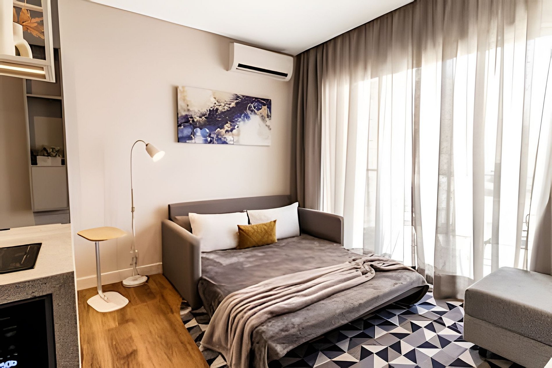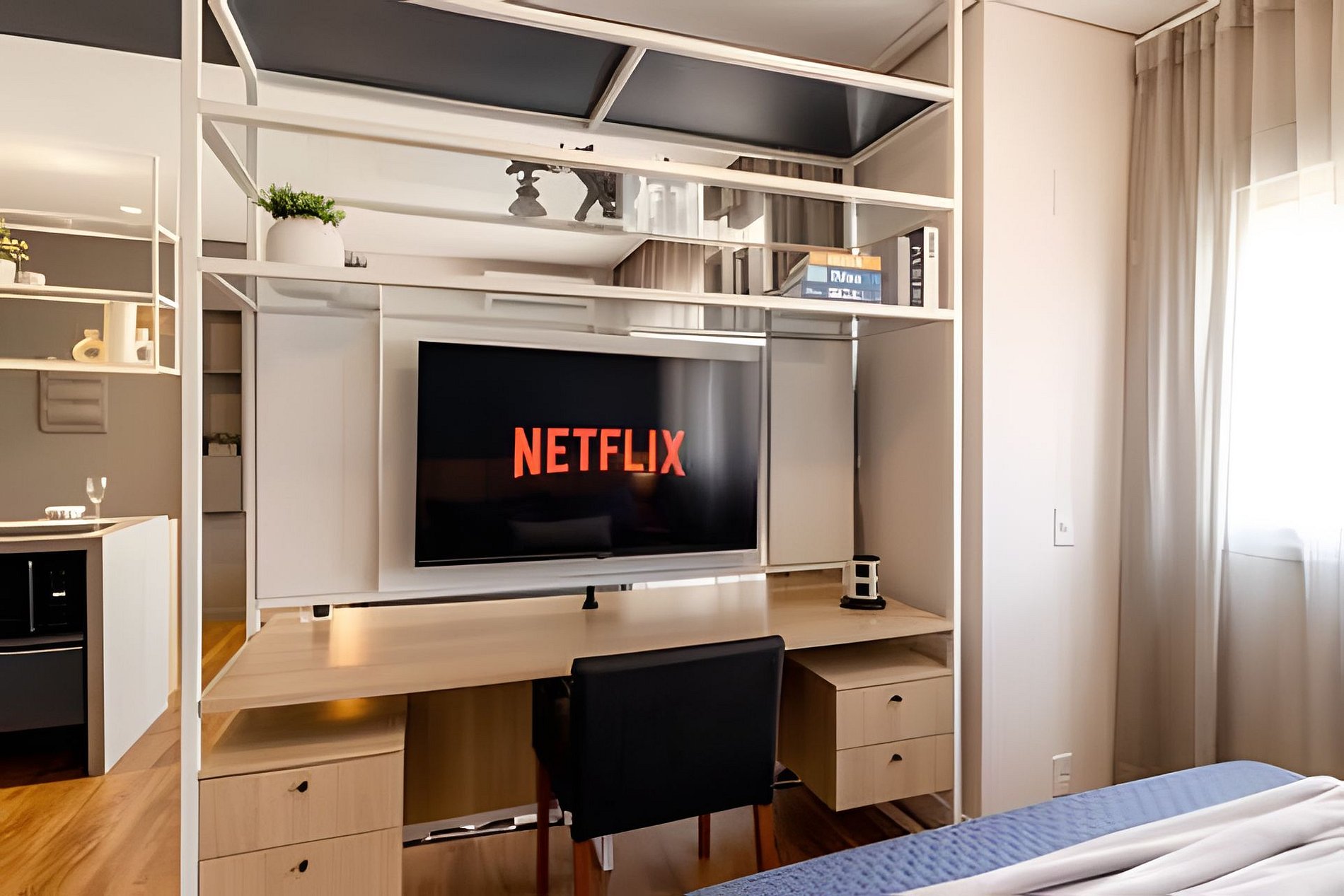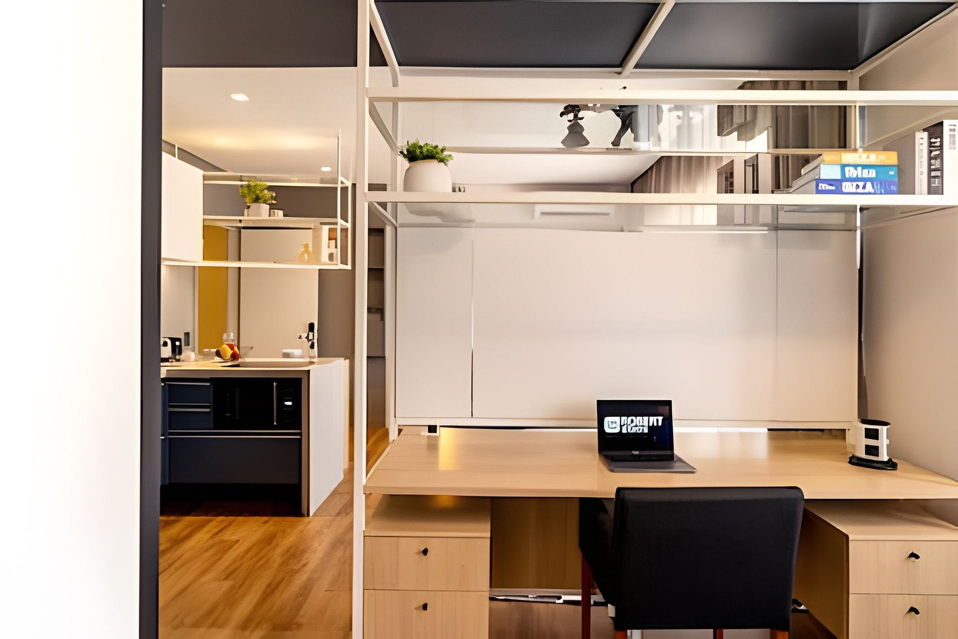 Ambiente climatizado com ar-condicionado Estação de trabalho para home office Sofá-cama Queen para 2 pessoas Mesa de jantar para 2 pessoas, perfeita para refeições especiais Integração harmoniosa com a cozinha