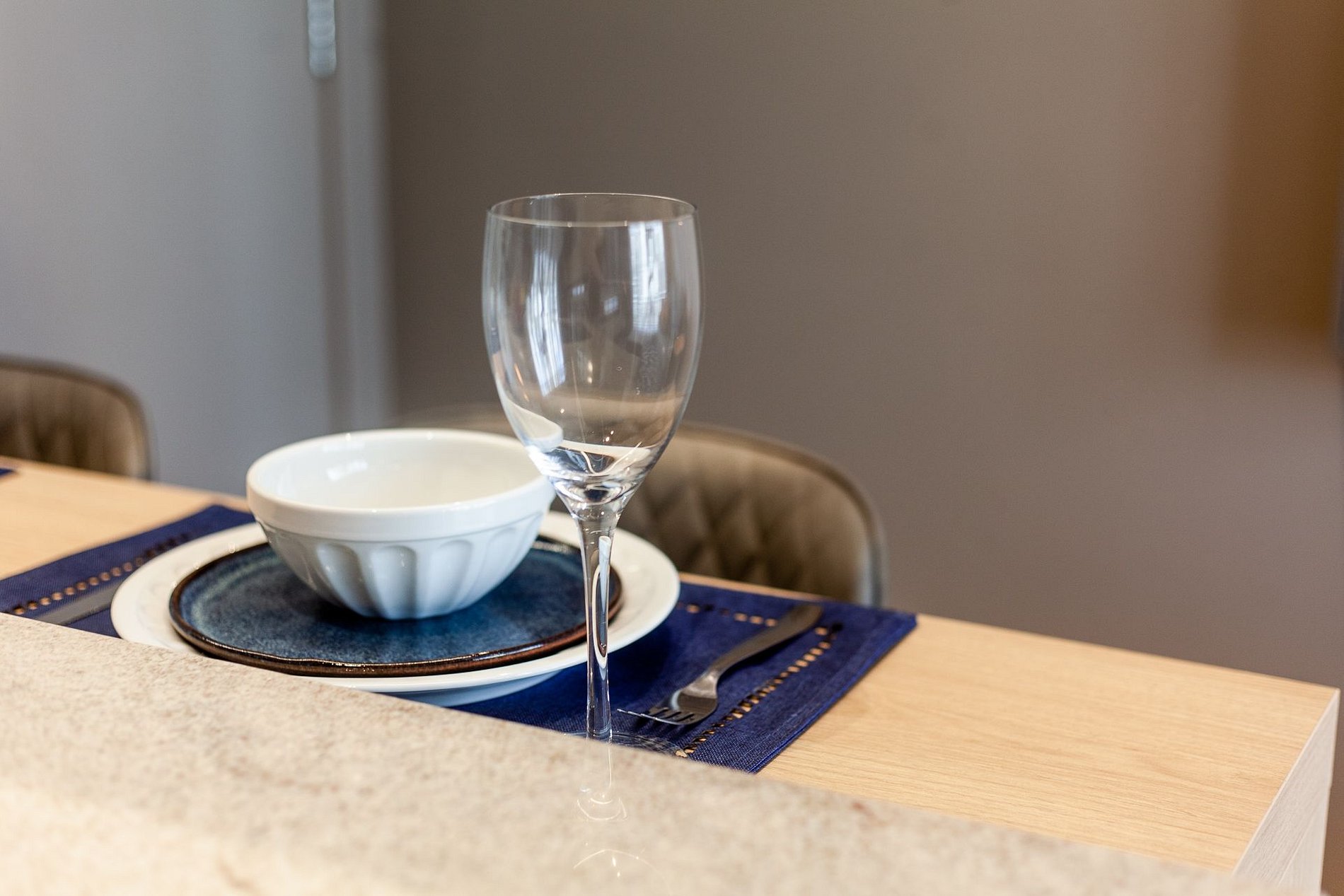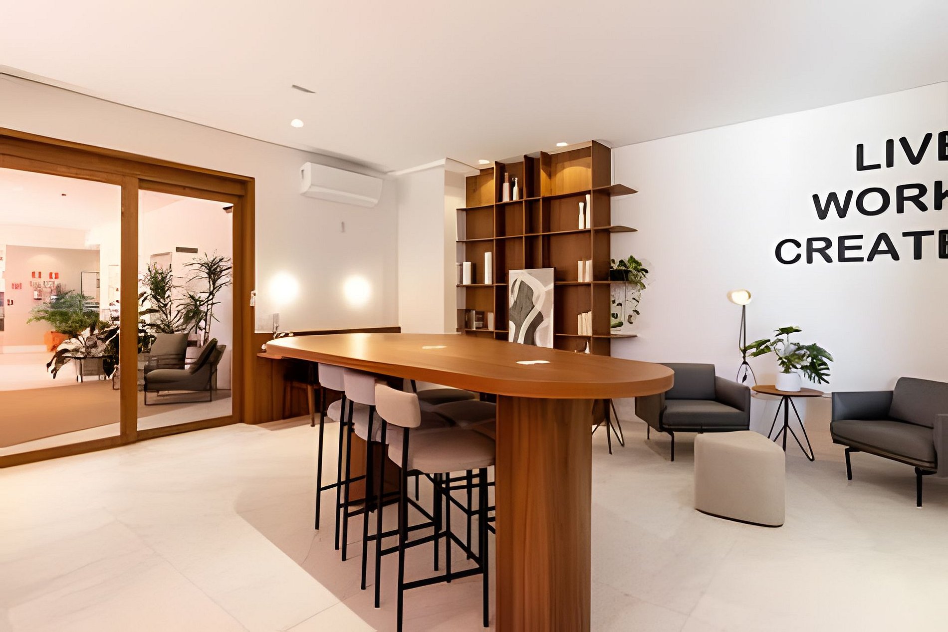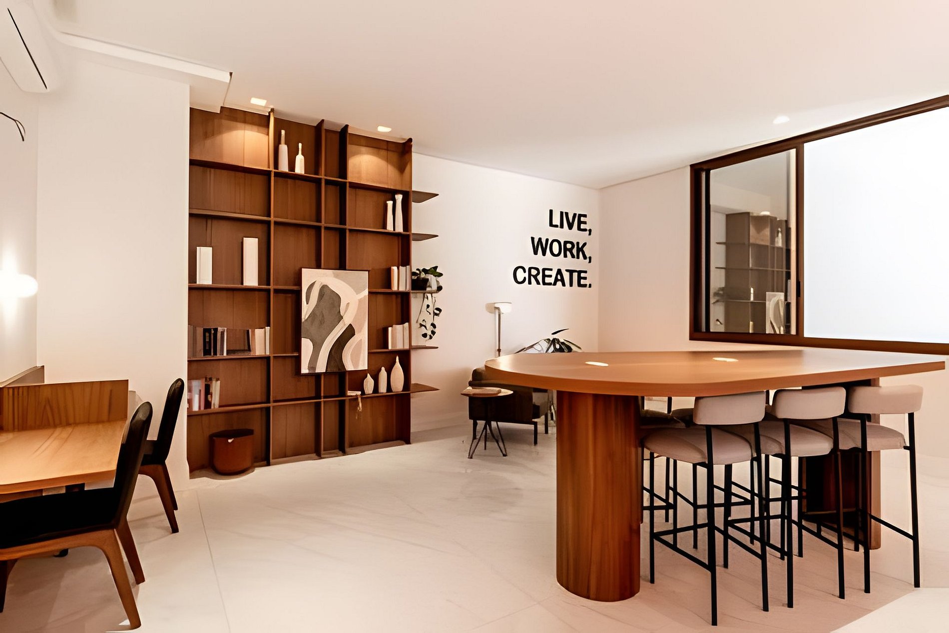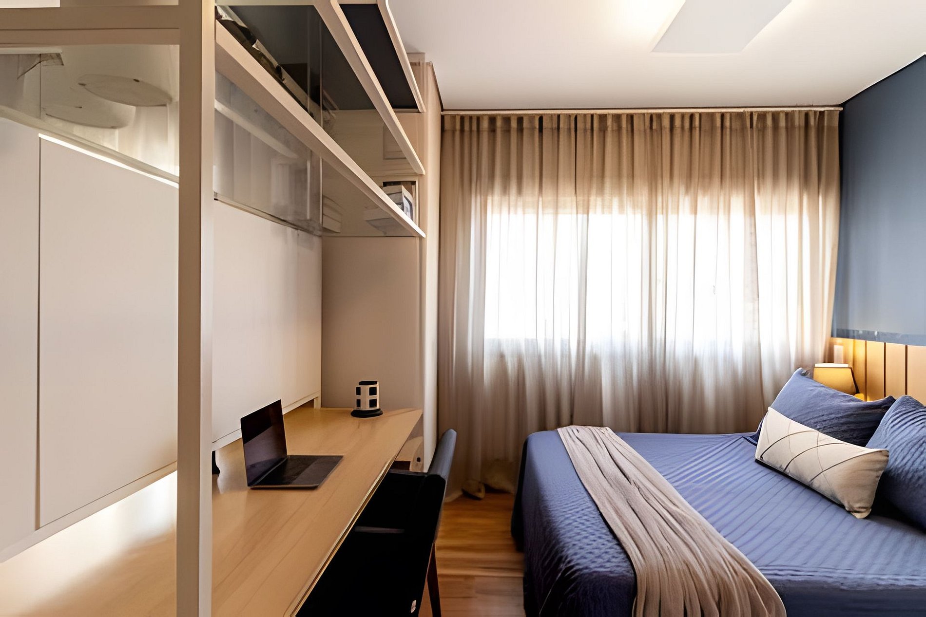 Ambiente climatizado com ar-condicionado Estação de trabalho para home office Sofá-cama Queen para 2 pessoas Mesa de jantar para 2 pessoas, perfeita para refeições especiais Integração harmoniosa com a cozinha